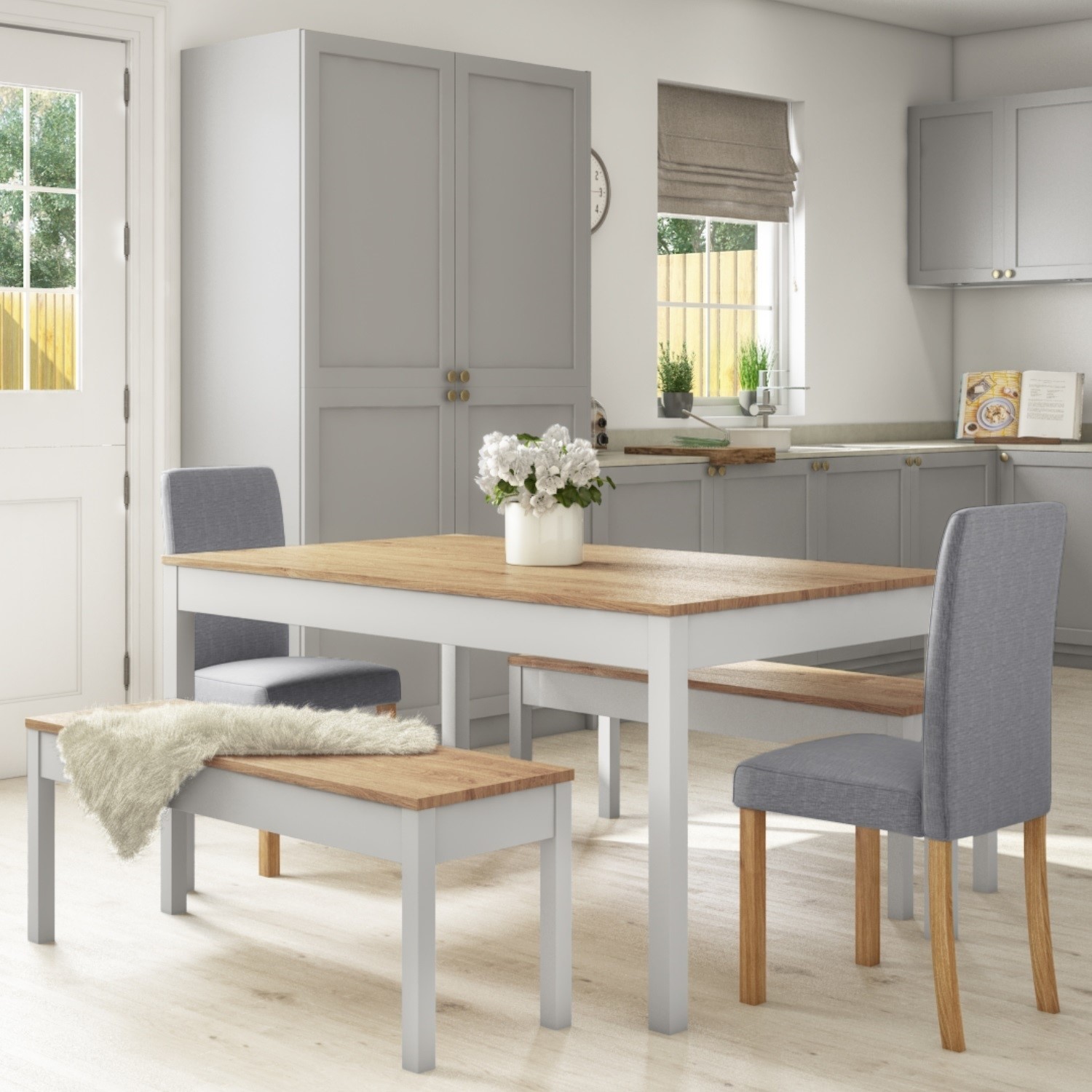 Grey Solid Pine Dining Table 2 Grey Chairs 2 Benches New